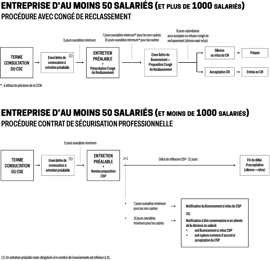 – pas de mesures sociales d’accompagnement hors le CSP – contrat de Sécurisation professionnel France Travail ou le congé de reclassement dans les entreprises et groupes de plus de 100 salariés,